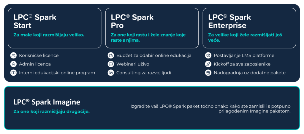 LPC® Spark je temeljen na našoj LPC® LMS platformi, bogatom katalogu edukacijskih programa i stručnom pristupu HalPet tima kojeg gradimo već 25+ godina. Kako bi svaka tvrtka pronašla svoj idealan spoj elemenata, kreirali smo četiri paketa na koje se možete osloniti kako biste postigli vaše ciljeve.